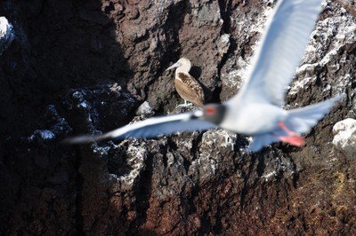 The first bird we see is a blue footed Boobie, relatively common in the Galapagos but not indigenous to the islands. Paul talked about how they got their name in an earlier blog. I know what it is like going through life with an unusual name. Sometimes it isn't fun but i'll take 'Beryl' over 'Boobie' any day. One interesting piece of trivia about a Boobie is when they feel like a meal and dive to catch a fish, they hit the water at about 70 miles an hour. That could hurt but they make it look easy and seamless. There is no particular mating season for Boobies, it's whenever the mood strikes. But when the mood strikes they do the 'Boobie dance' and the female gets to pick her male. Most attractive to her is a male with deep bright blue color legs. That bright color tells her he is healthy, well feed, strong, and able to provide food. Clearly the Boobie in the pic here doesn't make the cut. I guess Blue is the color of birds here as another one we saw this morning is the Blue Heron. Why it is called as such I can't explain, I see no blue. The lava heron is indigenous to the islands. It is hard to spot since it is the color of the lava rocks on which it sits. Sea food is abundant here but if you chose oysters for dinner it is an imperative you catch yours before the red beaked 'oyster catcher' bird beats you to it. If your preference is crabs for dinner you may be out of luck. There are 'Sally light foot' crabs everywhere, named for a woman named Sally who first found them. They are quite edible but protected so only the birds and the sea lions get to enjoy them. We think of penguins as cold water, cold geography birds this travel in huddles. However the Galapagos is home to tiny little penguins, the third smallest of the breed, that are solitary. It's a good thing there is no speed limit in the Pacific ocean because these penguins swim at 50 miles an hour. A young one stands here surveying the area around. How do I know it is a young penguin? Because its white fur around its neck is not ringed with black. Paul had a great sea lion experience on his hike, my sea lion encounter was more sedentary but i thought my pic was pretty good so i included it. So there you have it, more birdlife than i have experienced in my entire 71 years.