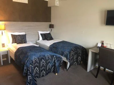 The Radisson BLU Polar Hotel boasts only so-so sunlight blocking window curtains, an amenity that I suppose ranks right up there with hot water and clean sheets--at least during the summer months. It is pretty bright in 2010, the room I am assigned on arrival. It's nothing fancy. Upon entering the "second building," there is a shoe rack. The custom is to remove your shoes so I do. Weird but it makes for cleaner carpeting.