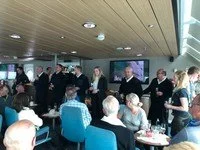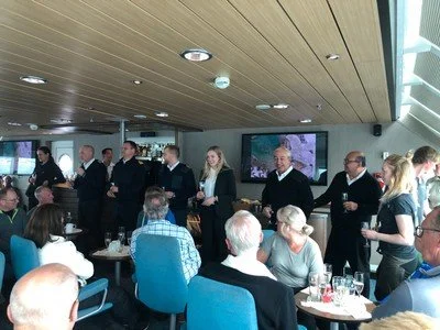 The captain hosts a cocktail party tonight. The hotel department head and ships doctor are both from Honduras. The safety officer and chief officer hail from the Russian Federation and the navigation officer hails from Romania. The captain himself, Alexi, is Ukranian. He works on both poles; he likes cold seas. He also allows for visits to the bridge, but while there “do not touch any buttons or our voyage will be a little bit shorter.”
