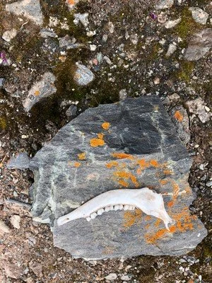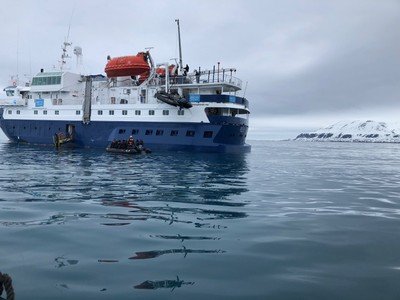 En route we beach ourselves at Ossian Sars Fjellet for a hike, dividing into three groups: easy, medium and hard. I opt for medium. It is muddy and at times steep but we follow Rutger and enjoy ourselves, first footfall on true Arctic wilderness. There are reindeer and the remains of reindeer past, birds of many ilks and a lone fox fitted with a GPS collar. The view back to M/S Quest, particularly for Atlanta’s Bill and Nancy is sublime.