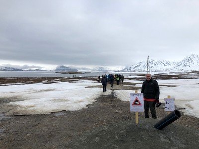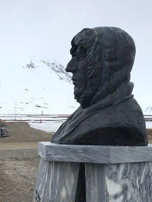 Originally a coal mining facility, many died here extracting that filthy fuel. For both safety and economic reasons, that activity ended here in the sixties. From here, various assaults to become “first man to make it to the North Pole” originated. Many failed, many succeeded. Airplanes and dirigibles took flight to make it that final way—quite a long way—northward. Rutger explains about Roald Amundsen (1872-1928) who is commemorated here with a bust. We are mindful of the “STOP!” POLAR BEAR DANGER sign which warns, “Do not walk beyond this sign without your firearm.” Our guides have them; they always have them.