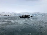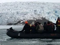 But, when Elke came on the PA system with our wakeup call at 7:15 I was deep asleep. Breakfast at 7:30, into warm clothes and rented rubber boots and aboard Zodiacs at 9:00. The sky is overcast, the temperature in the high thirties but with windchill as we motor toward the glaciers it is much colder.