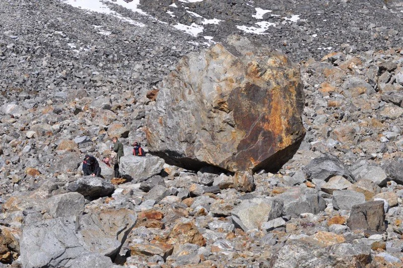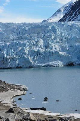 At one point we achieved two goals by sitting on rocks to rest and being completely silent; “no talking, no Velcro, no camera shutter noise please.” Our timing was auspicious as a noise that I can only compare to a clap of thunder in the distance radiated from the glacier. There was no visual evidence of what caused that sound; I had expected to see the glacier “calving” but that was not what happened. Nothing happened. Except for whatever made that amazing sound deep inside the dense blue ice.