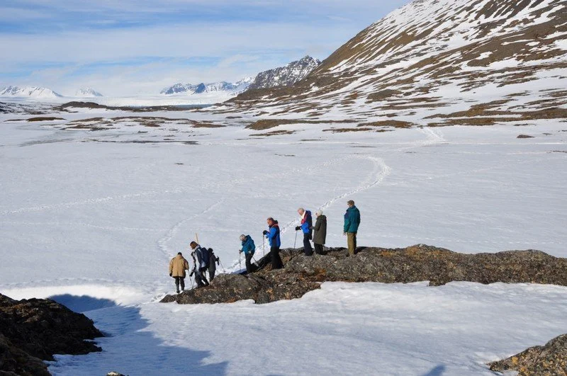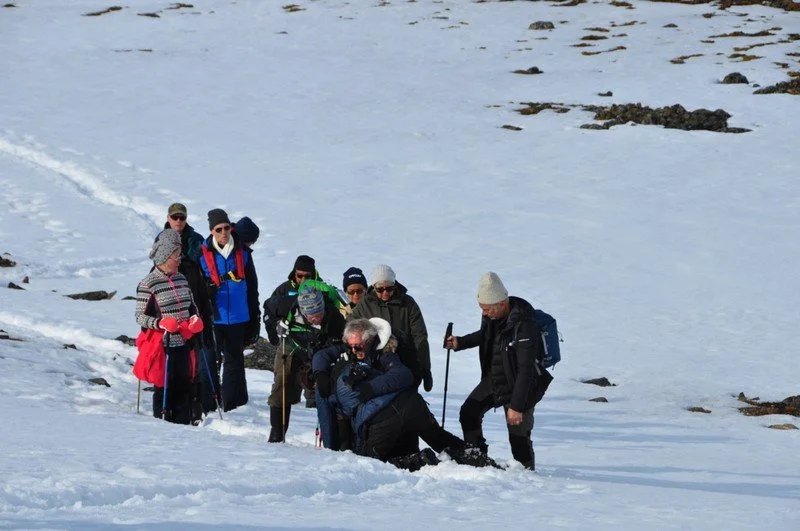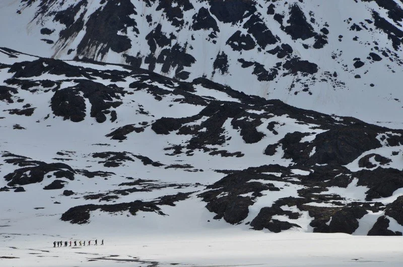 The resting hour over, at Mollerfjorden, it was time for another hike at Signehamna. Again, I opted for medium but a surprise was in store. Whether by design or accident, we embarked on the hike of my life. Over hill and down slopes, across snow fields, fording streams of icy water, through deeper snow where your foot sinks in to your thigh; it all happened on this afternoon’s “medium” hike. We all made it but just barely.