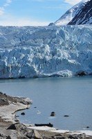 We are in Mollesfjord at the glacier where the waters are calm if cold. Launching the five Zodiacs we head for a beach about a mile from the face of the glacier to hike. The 46 of us are divided into four groups: the “young people,” and easy, medium and difficult hikers. As with last time, I opt for medium.