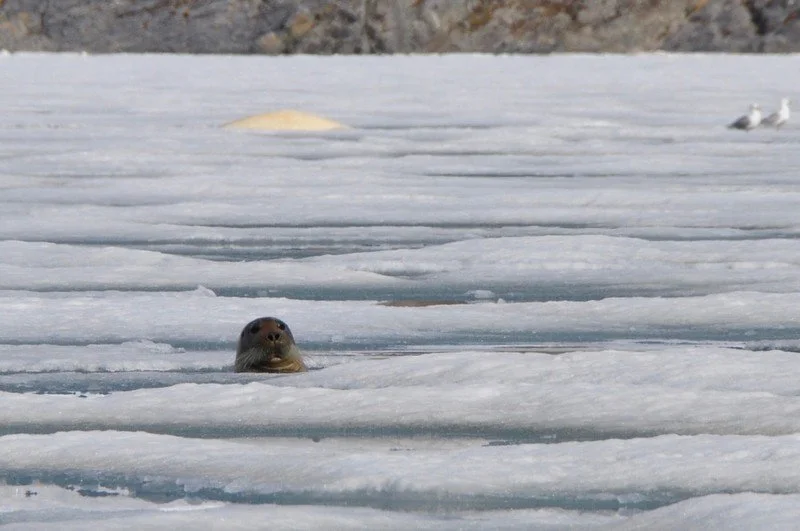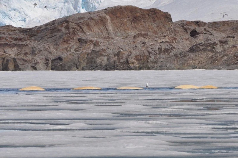 The temperature warm up, coupled with virtually no wind, means I dress light knowing the risk of change that is always afoot. We set off for the pack ice in front of still another glacier and spot scores of beluga whales surfacing at breaks inside the ice pack. Belugas are not photogenic but you get the picture from the picture.