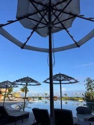 Of course, check in time at the Hilton is 3:00pm, eight hours after I walk into the lobby. No matter. I have packed so that all I need for poolside--the Hilton doesn't have a sand beach--is easily accessible and, after a quick change in the men's room, I'm ready to bask and/or nap by the enormous pool until they tell me my room is ready. I won't get much help finding shade from the very unique and also very damaged umbrellas. I decide to get my walk in. Downtown and back is my standard: four miles.