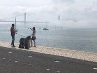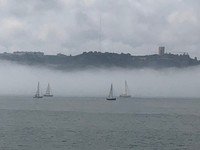 Lisbon, Portugal, is near a perfect natural Atlantic Ocean harbor at the mouth of the Tagus River which winds 600 miles westward from central Spain. Fog was lifting from the river revealing sailors and fishermen as we arrived. Here, the Tagus is spanned by the second longest bridge in Europe, the nearly 11-mile-long Vasco da Gama Bridge and by the shorter and less picturesque Ponte 25 de Abril Suspension Bridge which you see in the distance through our fog.