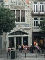 We enjoyed a coffee at the Majestic Café—a tourist trap to be sure but one in which it is most pleasant to be caught. Ward and Donna picked up the tab for Jim, Becky, B4 and me. We were all amused by precisely aligned pigeons only to realize that they were fake news aimed at keeping real pigeons at bay. They tell us that it works.. Up Rua de Santa Catarina, we were more accurately enchanted by a sculpture festooned façade.