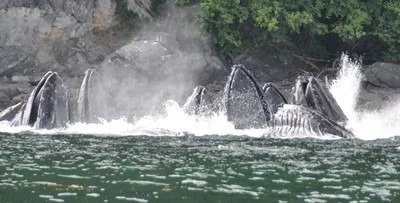 The thing I came to see I saw not once, not five times but over and over again. Bubble net feeding. Working as an organized group, what we think was 16-18 individual humpbacks averaging 40 tons in weight dove, organized themselves (possibly through song communication which we could hear) and then rocketed to the surface through a school of herring. They each scoop up a mouthful of maybe 20 herring per whale. Again and again and again.
