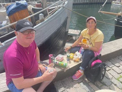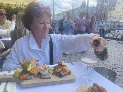 Well, our alcohol at lunch coupled with the unending parade of people of all nationalities, all shapes and sizes, speaking a multitude of languages, behaving in varying ways among family groups of varying sizes offers us unending theater over our smørrebrøds. Should adults consult other adults about what they ask their stylist to do with their hair? Are tattoos really a good idea? Who should, and who should not, wear crop tops? Would it be a good idea for the average pedestrian to consider employing a wardrobe consultant? We wonder if he or she passing by "always looked like that?" We agree that it will be a great reward for us to be like the occasional elderly couple passing holding hands as they stroll. We consider that public displays of affection--in moderation--are a fine idea for the over sixty set. It is clear to us that most babies are darling while laughing and sleeping but that they represent a lifetime of expense, worry, and heartbreak with happiness thankfully followed by the reward of joy, amusement and a place to leave one's money. A word from me, underlined so that you know we have switched authors. Don't get Paul wrong, we love our kids and our grandkids. We're just happy that in our 70's our kids are great (which does not meat that we don't still worry about them), we can give our grandkids back when they aren't happy, and we are footloose and fancy free. We wouldn't trade any of them for the world.