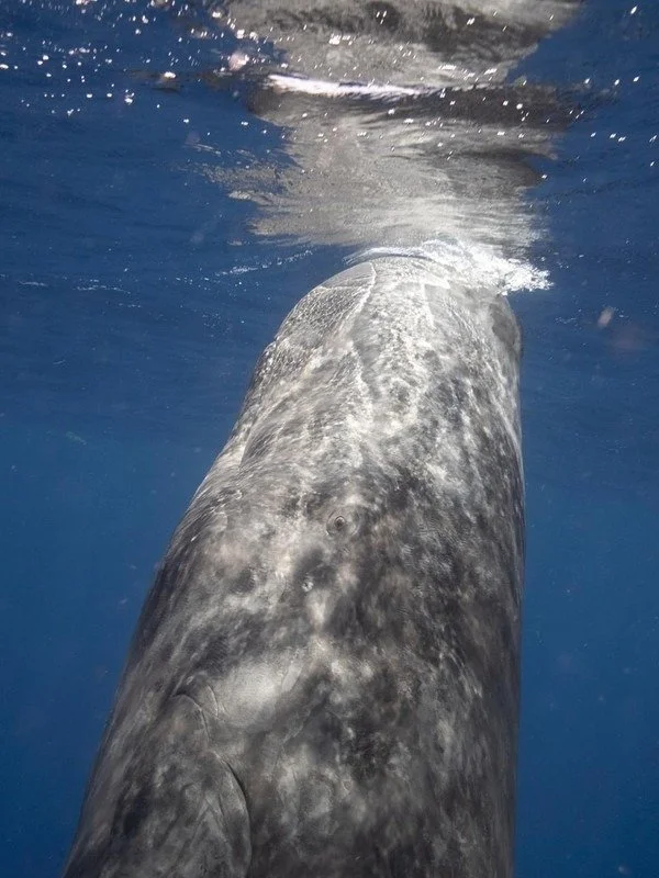Soon, she appears. I left my camera at home today intending to just take in the sight. I wish I hadn't done that because this calf was waiting on the surface--and slightly below it--for her mother to return from a deep feeding dive. It takes a while for a sperm whale to dive to, say, 1,500 feet, locate a giant squid, catch it, eat it and return to the surface. So what does the daughter do while mom's away? She plays. She's curious. She spots us and she does what any toddler would do. She tries to figure it all out. We don't approach her too closely nor does she approach us. We just take each other in. She twists and rolls. When I first spotted her, she was swimming from left to right upside down, the line of her lower jaw clearly outlined--you can't miss it. Fortunately, Patrick got the shots. Here are two of his wonderful photographs of this moment.