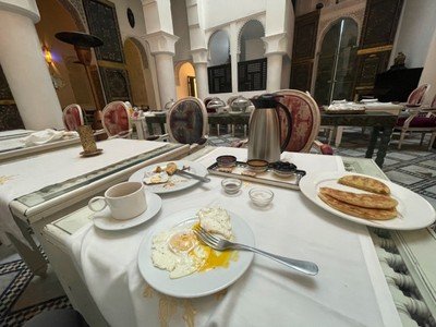 My travel arranger at Wanderlust Voyages, Megan, is married (I learned) to Bill who arrived here to meet me and with whom I shared a glass of local red wine. Bill reiterated the difficulty facing me with the Omicron variant now front page travel news. It seems that tomorrow at 11:59pm, the government of Morocco may be closing its airspace to some--or maybe all--flights both in and out to some--or maybe all--countries. It is a ten hour drive from here to Casablanca. The roads are dark and two lanes wide. The Qatar flight tomorrow to Doha--the one I am booked on in a few days--if it even operates leaves at 3:10pm. International flights require a three hour before takeoff check in.