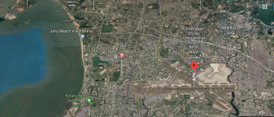 As we finally approach Chhatrapati Shivaji Maharaj International Airport, the lights--or lack of them--reveal that the east end of runway 27 is about 1.5 miles from the beach on the Arabian Sea. At night, the sea is pitch black. The airport is surrounded on two other sides by slums