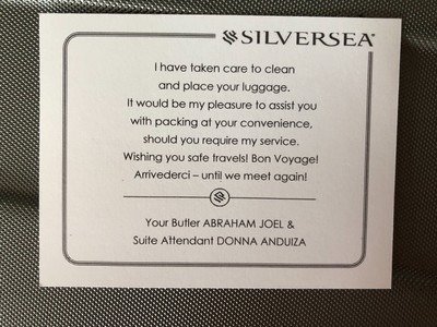 When we returned to our suite, B4's bag was perched atop a luggage stand with this note on it: