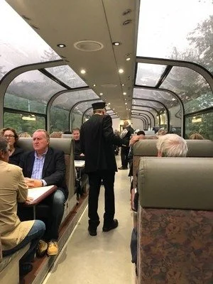 Out the doors of the reception hall building we undertook a short thirty-yard stroll to Car Two, Seats 3A and 3B, tucked our carry-ons under our seats (there are no overhead bins for luggage as that would block the view) and settled in. We were quickly joined by an English couple from Surrey and B4 commenced a convivial conversation about “The Royals,” a favorite subject of hers. All aboard is at 7:40am.
