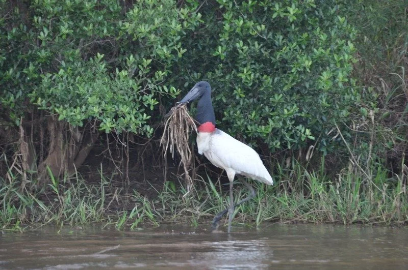 As has been our luck, we are soon greeted by wonderful sightings: a jaribu stork gathering materials for a nest, a prowling jaguar (our eleventh sighting), around twenty boats of fishermen—we had seen no fishermen on our prior four days—all prior to our arrival by boat at Porto Jafre.