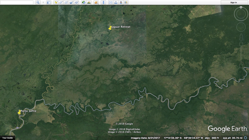 The twists and turns of the river can easily been seen on Google Earth. Here's a screenshot. If you want to spend some time with it yourself, go to Google Earth and search for Porto Joffre Brazil. That's your starting point. Jaguar Retreat is located at 17 degrees 09’51.35”S 56 degrees 34’56.98”W
