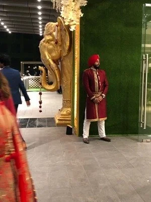 You could, if you like, stop at various stations offering tidbits of food and drink or sweets. We didn't but many did. Divided into three separate thirds, the center reception hall greeted you with fountains in front of a waterfall. Again, flowers dominate. There is food and drink here as well. Remember, no alcohol and no meat or chicken or fish. Nobody misses any of that including us. On the left is the wedding "chapel." This room is elevated with risers hosting stuffed chairs and couches, each seat equipped with a goody bag containing a program of sorts, a bottle of water, a snack and a silver whistle/tamborine device used for noisemaking at appropriate times. We quickly located our reserved seats...on the front row. Our friends from Israel, the Tannenbaums, beautifully attired, were close by. But then, everyone was beautifully attired. At home, elegant black would be worn. Here, other than Elliot's magnificent Indian tuxedo type sherwani, black was seldom seen. Instead, a cacophony of color and pattern and hue, elegantly wrapped with nine-yards of fabric needed to create a sari was the rule. American women could take a lesson from these Indian fashionistas and boutiques from coast to coast would find their sales soaring. Duppattas (the over-the-shoulder shawl often seen) would be a major accessory additional item used to increase the average transaction size (me: once a retail consultant, always a retail consultant). Men too; elegant tuxedos pale compared to what we men sported. It would also be good for the salon industry. Prior to leaving the Trident B4 and I visited the draping and hair preparation salon to ensure that we looked our best in our unfamiliar finery.