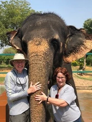 Today is otherwise planned as a quiet morning.B4 has a 10:00am 90-minute hot-stone massage and we will repeat our game drive trek at 2:30. I plan to have another visit with resident elephant host Lakshmi who is on duty at the front gate beginning at noon. The brochure listing enrichment offerings reads thusly: “Indulge into a playful session with Lakshmi and learn how social interaction, training and structured play builds trust and rapport between the mahout and the elephant Enjoy rejuvenating activity of the elephant playing in the mud and taking a dip in a specially prepared mud pool for her. Get a chance to bathe and feed her and learn some very interesting facts about the behavior of our pet elephant Lakshmi.” Lest you be concerned about Lakshmi being exploited, it is clearly explained that she was rescued from a circus and had no hope of being returned to any sort of wild or natural existence.