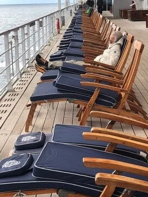 Deck seven promenade is populated by 175 lounge chairs in a soldierly formation, dressed and covered, on the port side and the same on the starboard side. The deck crew breaks out cushions on the sunny side and the deck chairs become a popular place to sit and read or nap. On the shady side they beckon but are refused. If it is raining—which it did only a couple of times and not for long—the entire deck remains unpopulated except for the diehard walkers who are discouraged by nothing short of gale winds.