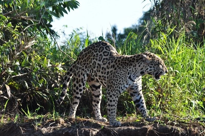 Soon the radio crackled with word that a pair of jaguars were walking the bank about a twenty minute fast cruise away so we hit the throttle to make for that spot. Our trek was interrupted by a sighting of a lone jaguar lounging on the bank. We stopped to watch her for a while and then continued our journey to find the pair.