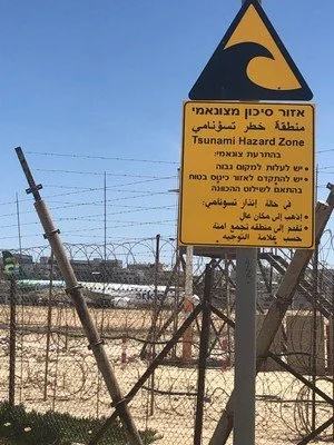 B4 has a "girl's lunch" with Aya along with a visit to her Tel Aviv store. While they gaggle, I again walk beside the sea but this time a few miles to the north, past the "downtown" Sde Dov Airport. On the Mediterranean side of the single runway is a sign that tells me it is in a tsunami zone. The sign is also of interest in another way. Most information signs here are in three languages: Hebrew, Arabic & English. It makes for some pretty busy signage.